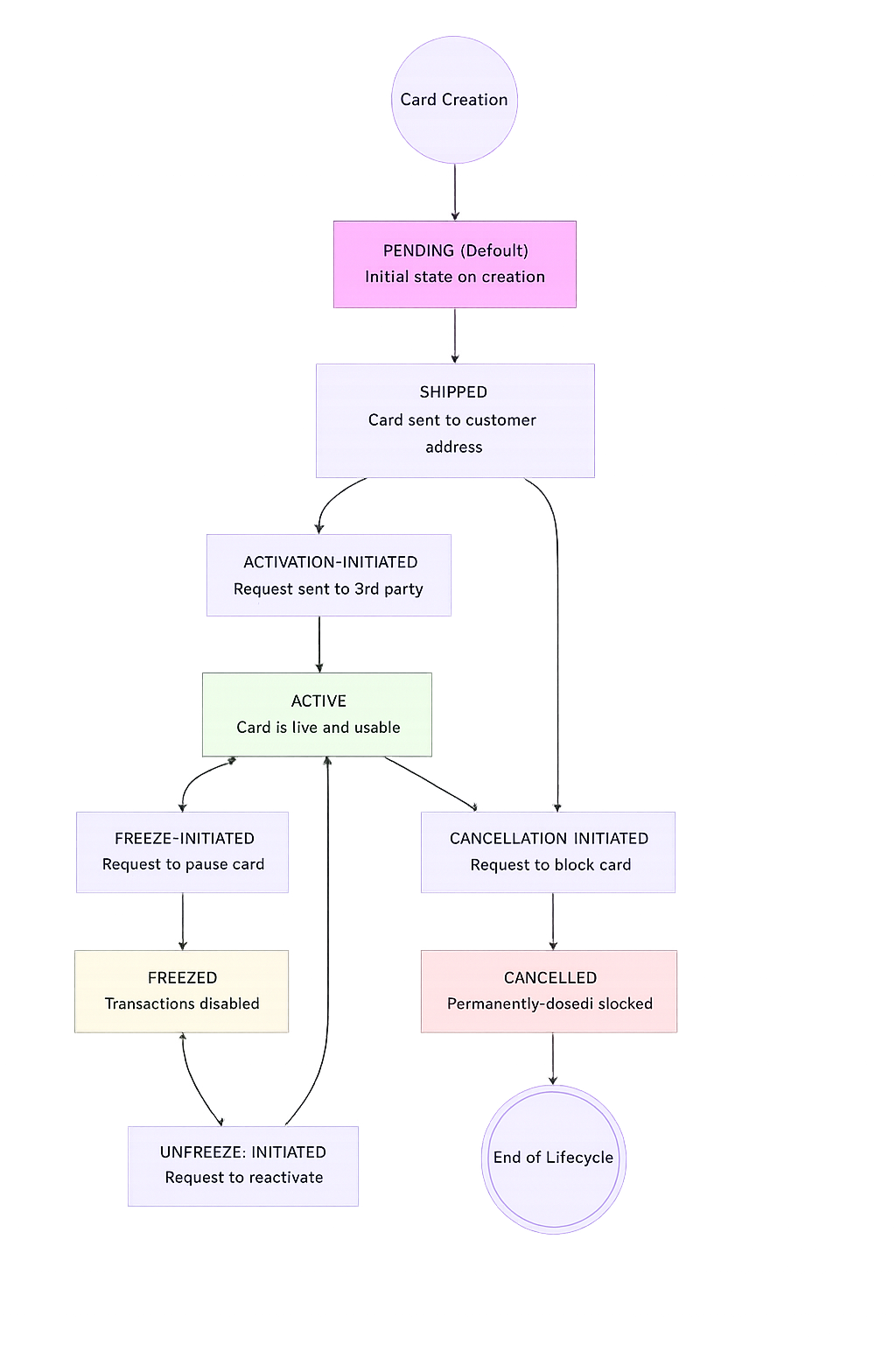 Every card moves through controlled states from creation to termination. These transitions ensure that cards are only usable when valid, and restricted immediately when risk is detected.